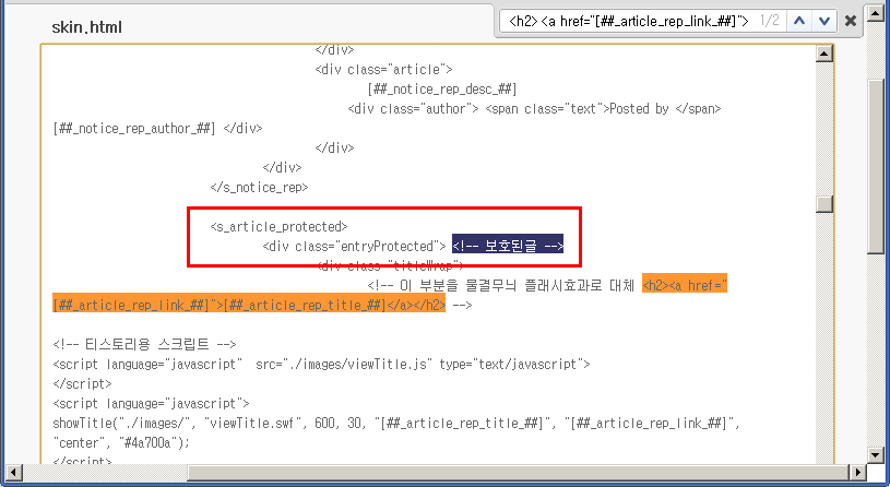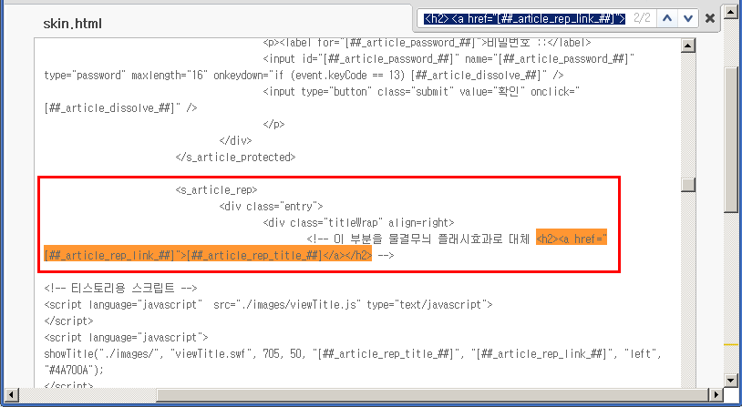 ⑥ Ctrl+F를 누르고, "<h2><a href="{##_article_rep_link_##}">{##_article_rep_title_##}</a></h2>" 를 찾습니다.(찾을 때, {}는 모두 [] 로 바꿔주세요.) 두 군데가 나올겁니다.