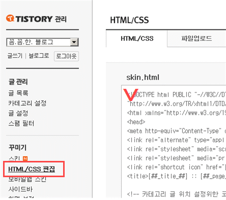 ⑤ 티스토리 블로그 관리자의 HTML/CSS 편집 메뉴의 skin.html 란에 있는 코드 부분에 커서를 위치시킵니다.