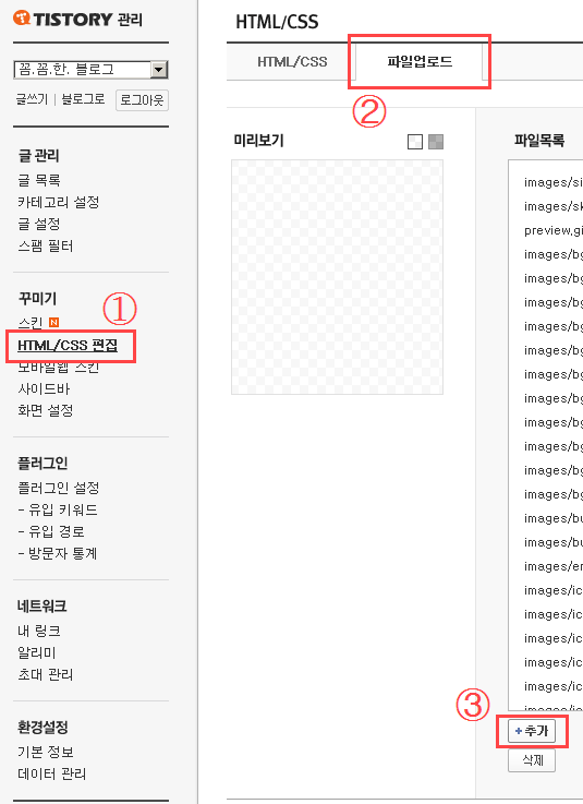 ③ 아래의 스크린샷을 참고하여 HTML/CSS 편집 -> 파일업로드 -> 추가 버튼을 누른 다음