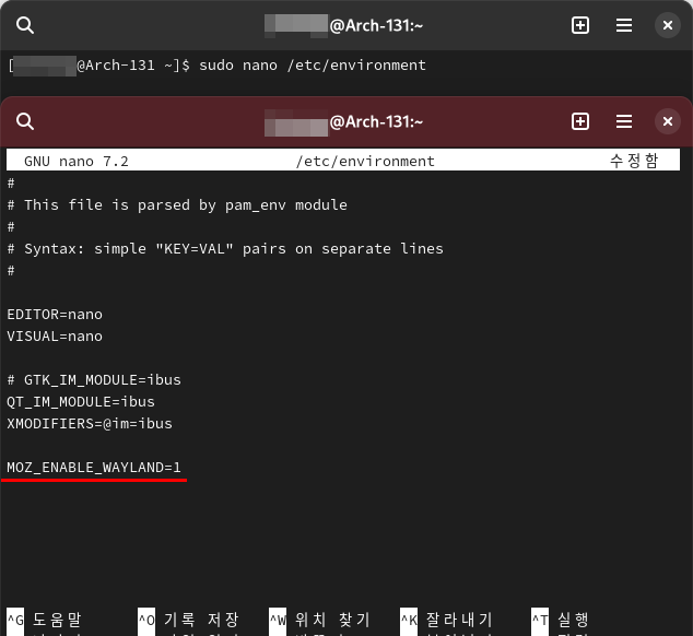 터미널 창에서 MOZ_ENABLE_WAYLAND=1 firefox 처럼 입력하면 Wayland 모드로 실행되는데, 매 번 이러긴 귀찮으니 환경변수에 등록하여 firefox 입력 들어오면 자동으로 앞에 MOZ_ENABLE_WAYLAND=1 값이 붙도록 할 겁니다.