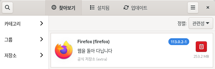 ▲ pamac (소프트웨어 추가/제거)로 Firefox 설치하고 실행했어요.