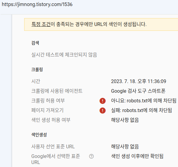 실제 URL 테스트 버튼을 눌러 색인 생성을 시도해 보면 "페이지 색인을 생성할 수 없음: robots.txt에 의해 차단됨"이라는 메세지가 뜨면서 진행이 막히는 경우가 많아서 놀라고 있습니다.