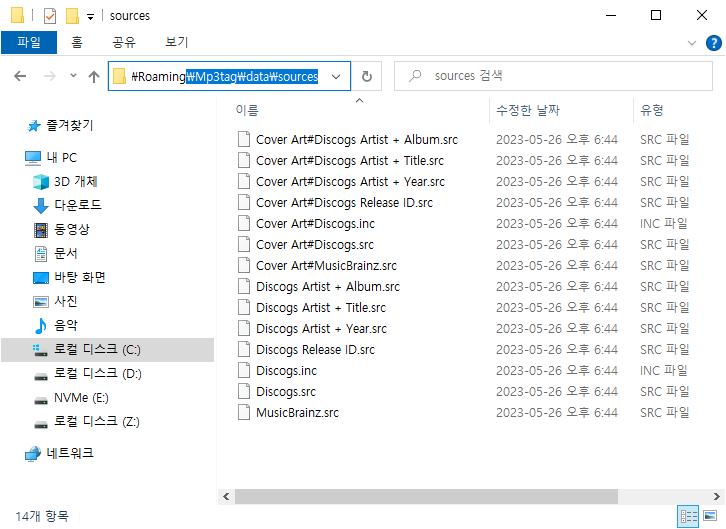 ▲ 그 경로에서 더 들어가야 됩니다. \Mp3tag\data\sources 까지 들어가서...