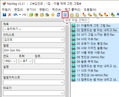 ▼ 2번 트랙을 보니, 트랙넘버가 한자리인 겁니다. 02 이렇게 두자리로 바꾸고 싶어서 "모든 파일 선택"했습니다.