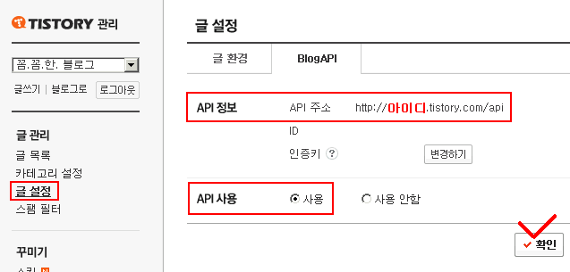 관리자 → 글 설정 → BlogAPI 로 진입한 뒤, ‘API 사용’에 체크해 주고 확인버튼을 누릅니다. 그리고 API 주소를 적어둡니다.