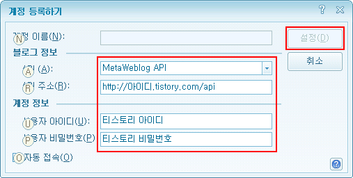 계정 정보에는 티스토리 아이디와 비밀번호를 적고