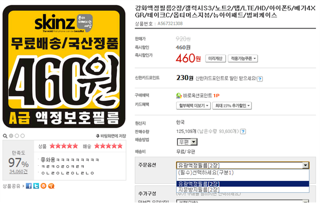 ↑↑↑ SKINZ 액정필름입니다. 접속해 보면 2장을 460원에 세일하여 팔고 있습니다. 기종 선택해서 수량 2개에 맞추어 구매하세요(920원이 되도록). 우편배송 체크 하시고요.