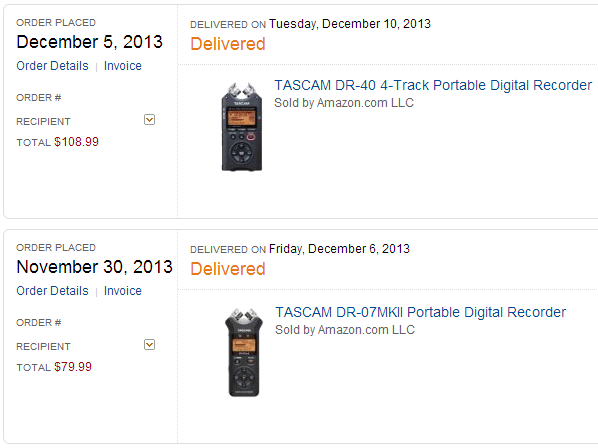 보이스레코더보다 월등히 많은 기능을 제공하고 있고, 내장마이크도 스테레오에다가 평탄하게 세팅되어있어 어쿠스틱악기 녹음이나 공연 녹음에 상당히 괜찮아 보이는 Tascam 사의 두 레코더.